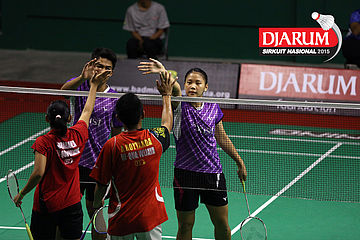 Galang Decky/Cynthia Shara (Djarum Kudus) bersalaman usai bertanding.