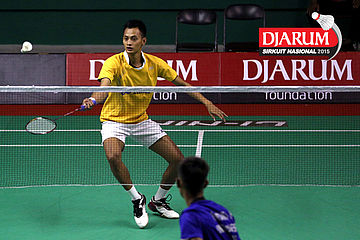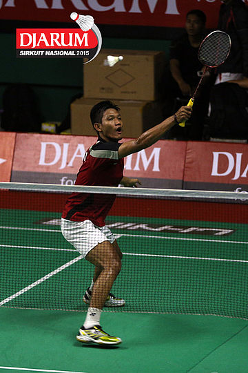Nugroho Andi (JR Enkei) bersiap menyambut shuttlecock.