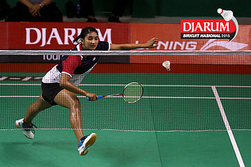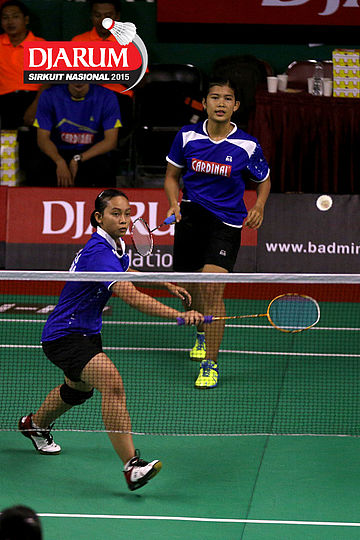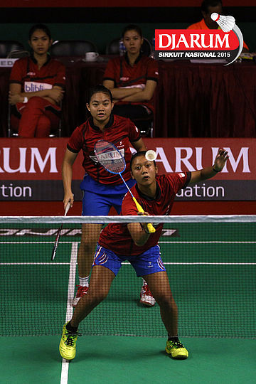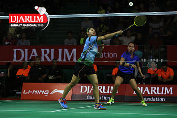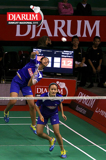 Cynthia Shara/Rofahadah Supriadi (Djarum Kudus) bersiap menyambar pengembalian.