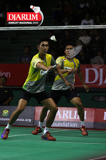 Afiat Yuris/Yohanes Rendy (Pertamina Fastron) mengembalikan shuttlecock.