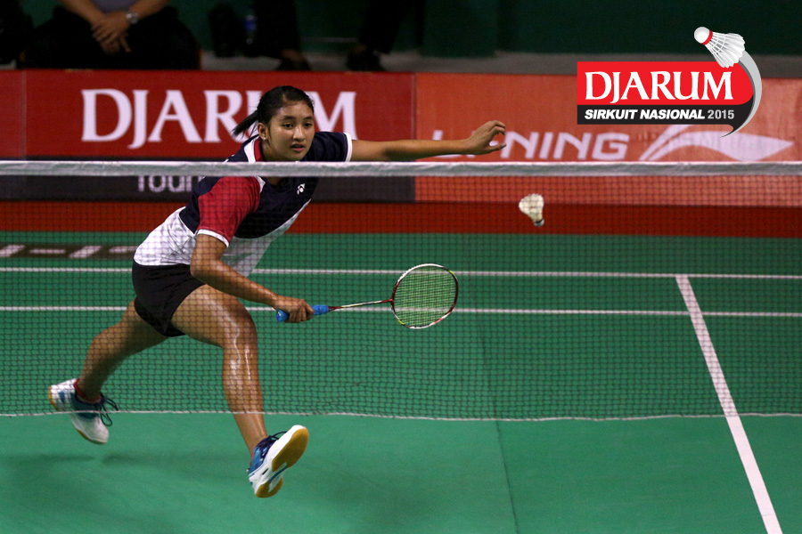 Deariska Putri/Nurbeta Kwanrico (Djarum Kudus) mengembalikan shuttlecock.