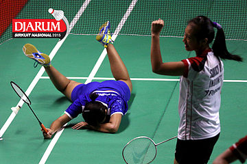 Mayrina Lukmanda (Mutiara Cardinal) terjatuh saat berusaha mengembalikan shuttlecock.