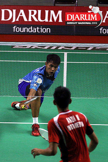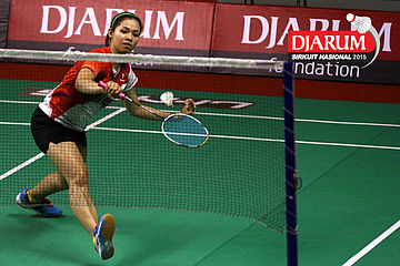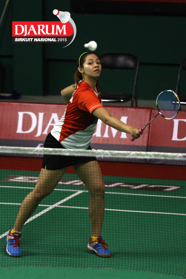 Febby Angguni (Tjakrindo Masters) mengembalikan shuttlecock.