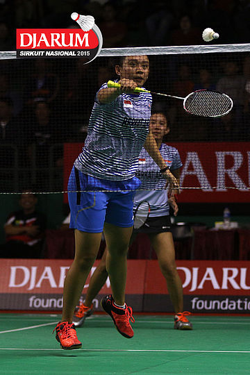 Cynthia Shara/Rofahadah Supriadi (Djarum Kudus) mengembalikan shuttlecock.