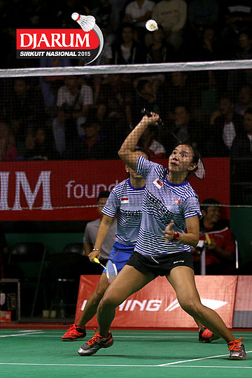 Tania Oktaviani/Vania Arianti (Djarum Kudus) melepaskan serangan.