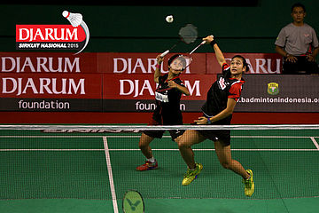 Aldira Rizki/Lisa Ayu (Djarum Kudus) melepaskan serangan.