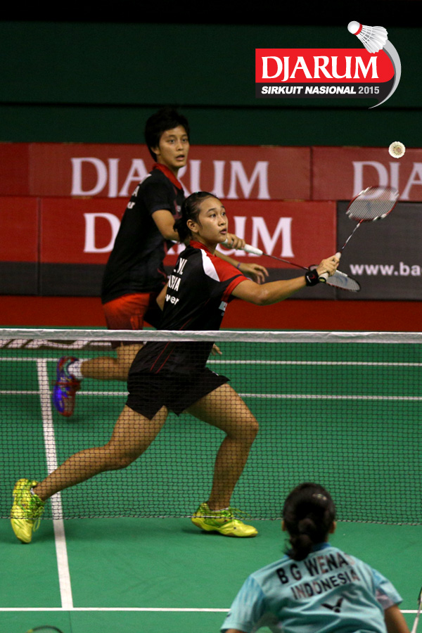 Aldira Rizki/Lisa Ayu (Djarum Kudus) bersiap menyambut shuttlecock.
