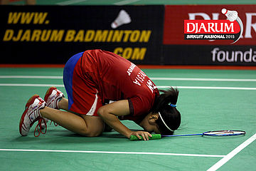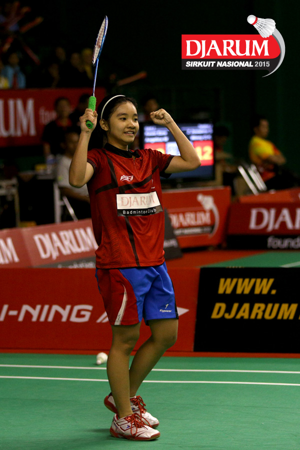 Titifany Illahi (Djarum Kudus) sujud syukur saat menjadi juara tunggal pemula putri Djarum Sirkuit Nasional Jawa Tengah Open 2015.