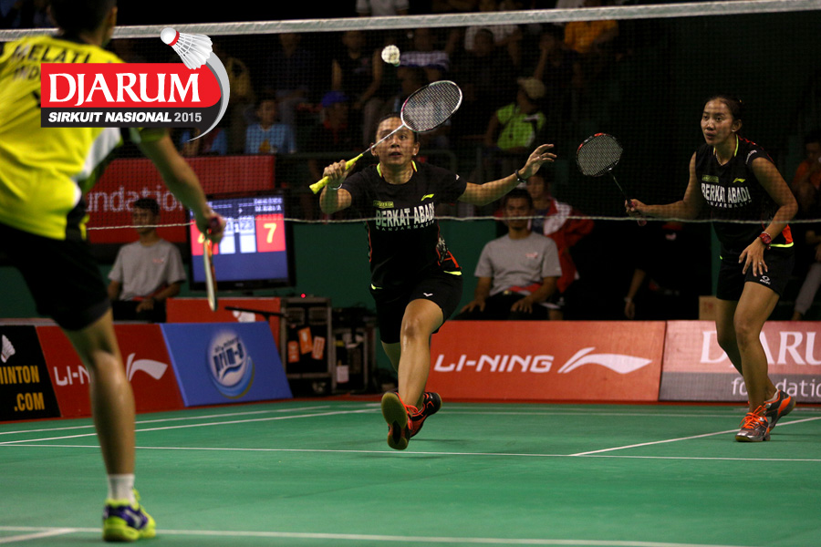 Devi Tika/Keshya Nurvita (Berkat Abadi) menyambut shuttlecock.