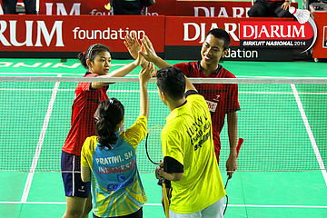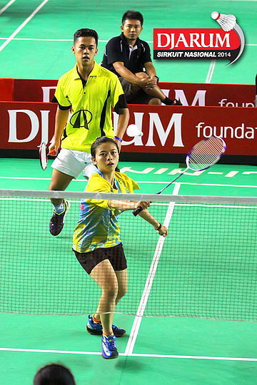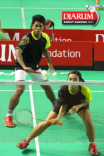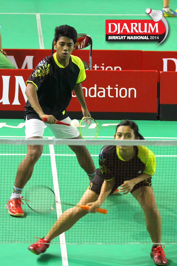 Lucky Lukman/Mita Sani (Citra Raya Unesa) bersiap menyambut pengembalian dari Ridho B/Rahmadhani Putri (PB Djarum)