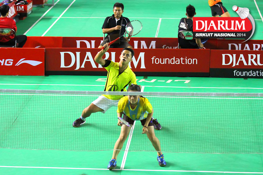 Lucky Lukman/Mita Sani (Citra Raya Unesa) bersiap menghadang serangan yang dilepaskan pasangan Ridho B/Rahmadhani Putri (PB Djarum)