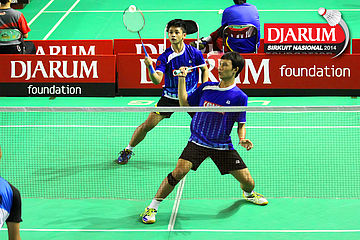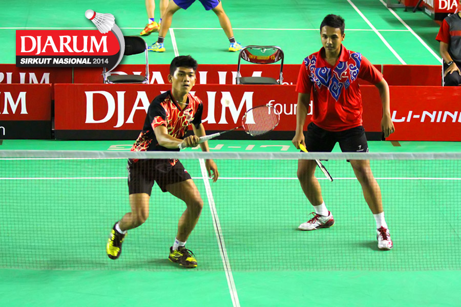 Deni S/Nugroho Andi (JR Enkei) bersiap menyambar pengembalian dari Ryan Sauqi/Stevan Indra (Mutiara Bandung)