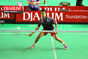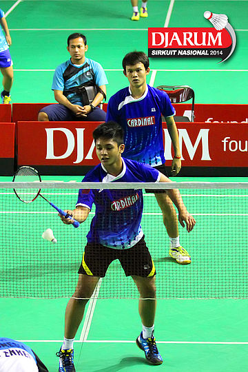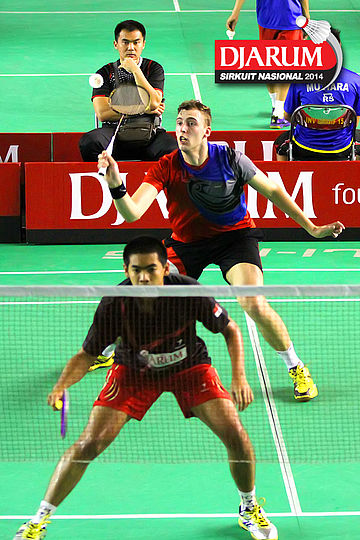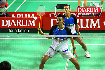 M. Herdianto/Teguh Putra (Indocafe Medan) bersiap menyambut pengembalian dari Toni Holm/Vicky Rizky (Swedia/PB Djarum)