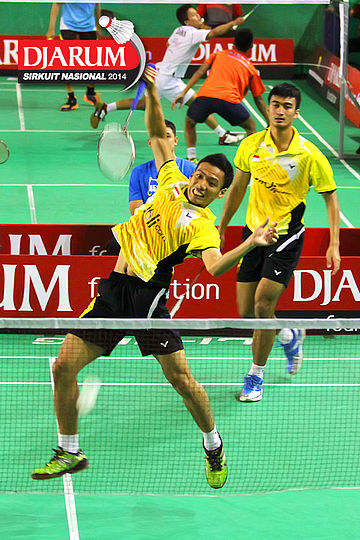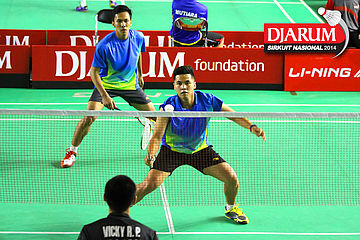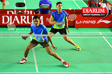 Lukhi Apri/Rafiddias Akhdan (Pelatnas) bersiap menyambar pengembalian tanggung dari M. Nur Rofii/Subhan Hasan (Jaya Raya/Bank Sumsel)