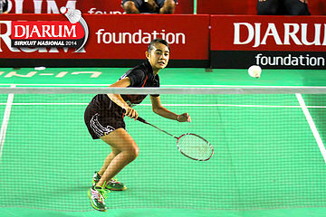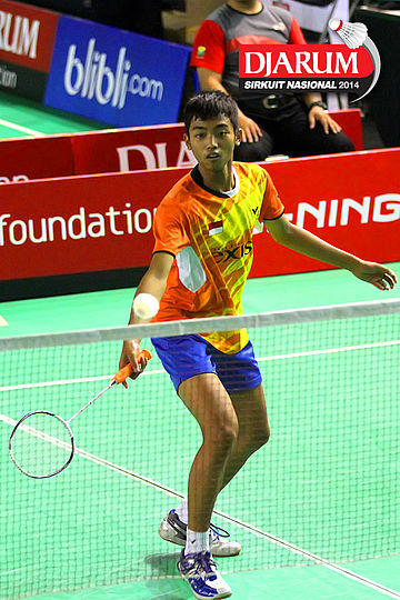 Calvin Ryan Mamoto (PB Djarum) bersiap menyambut pengembalian dari Andi Fadel (Jaya Raya)