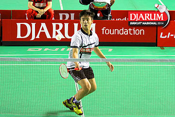 Andi Fadel (Jaya Raya) bersiap menyambar pengembalian tanggung dari Calvin Ryan Mamoto (PB Djarum)