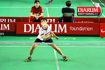 Danang Dwi/R. Eka Fajar (Jaya Raya) bersiap menyambut pengembalian dari Duthtee Gigih/Widu (Candra Wijaya)