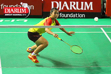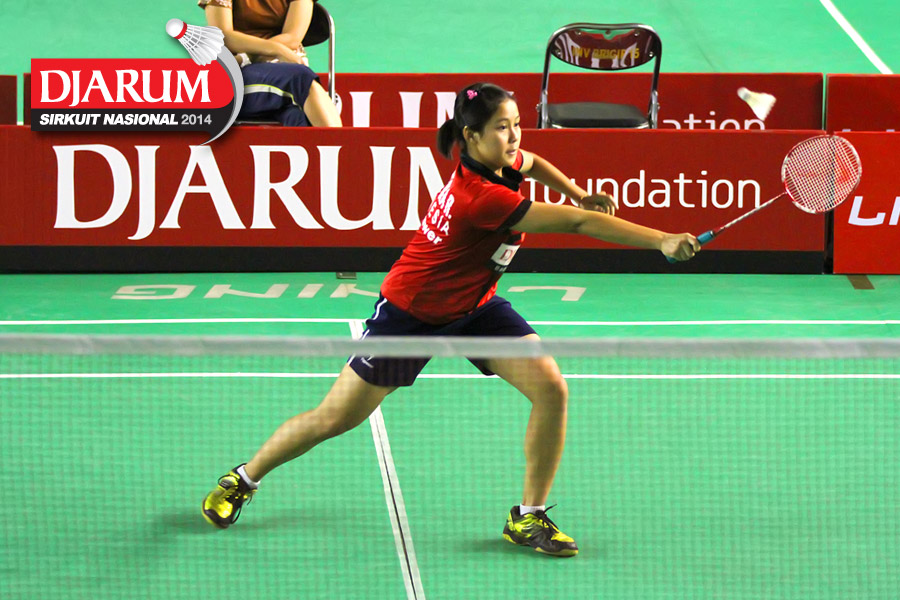 Agdevika Rochmadhani (PB Djarum) bersiap menyambar pengembalian dari Virny Putri (Jaya Raya)