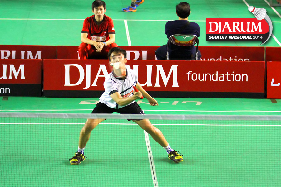 Calvin Ryan Mamoto (PB Djarum) berhasil menghadang serangan yang dilepaskan Andi Fadel (Jaya Raya)