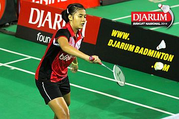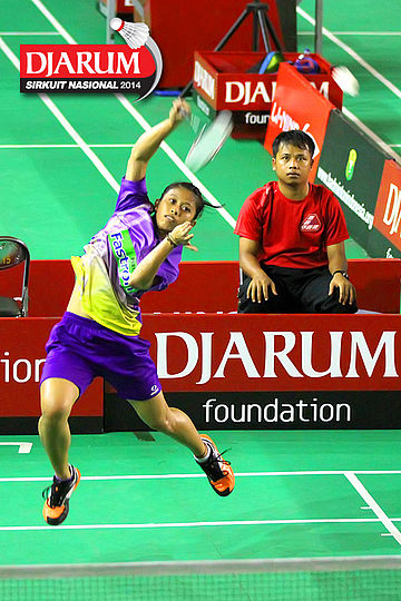 Dian Fitriani (Pertamina Indonesia) mengembalikan shuttlecock ke arah Tike Arieda (Jaya Raya Suryanaga)