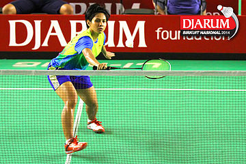 Febby Angguni (PB Djarum) bersiap menghadang pengembalian dari Fitriani (Pelatnas)