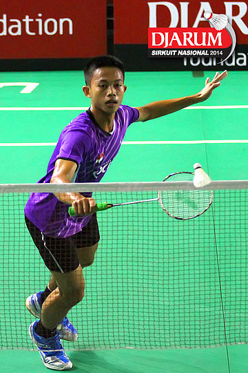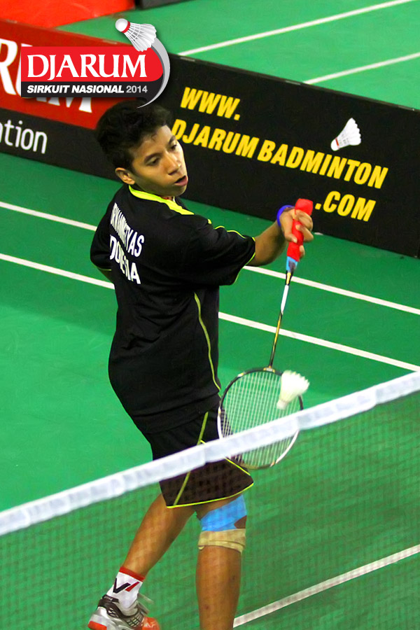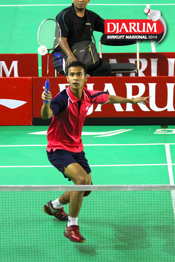 Thomi Azizan (PB Djarum) bersiap menyambut pengembalian dari M. Aries Ramadhan (SGS PLN)