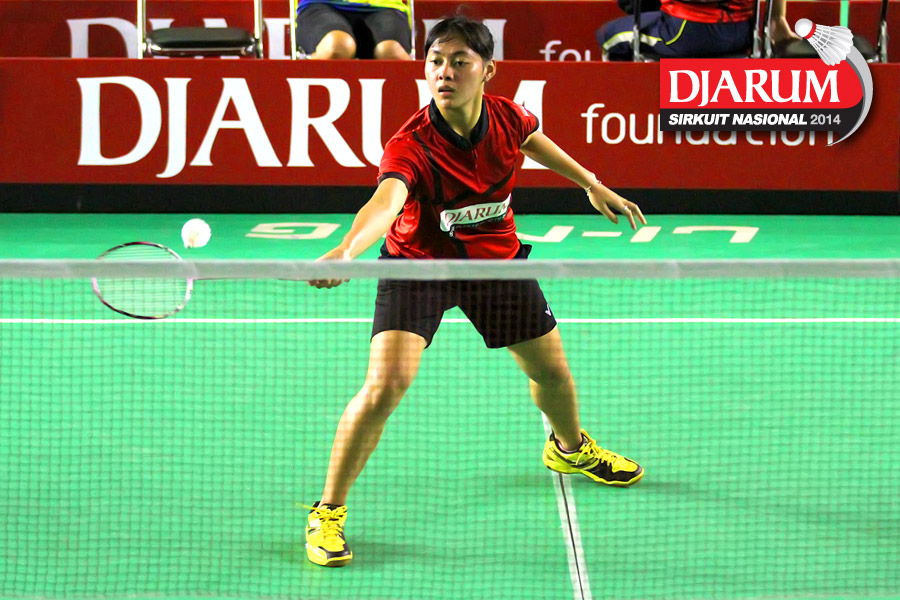 Yeni Asmarani (PB Djarum) mengembalikan shuttlecock ke arah Jessica Muljati (Shamrock Medam)