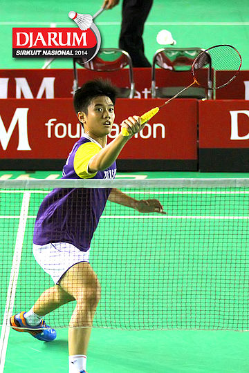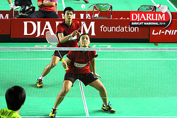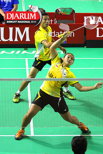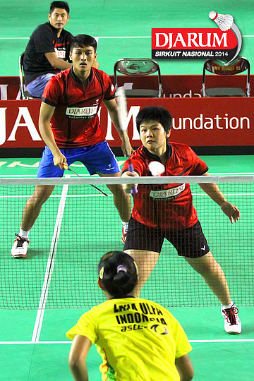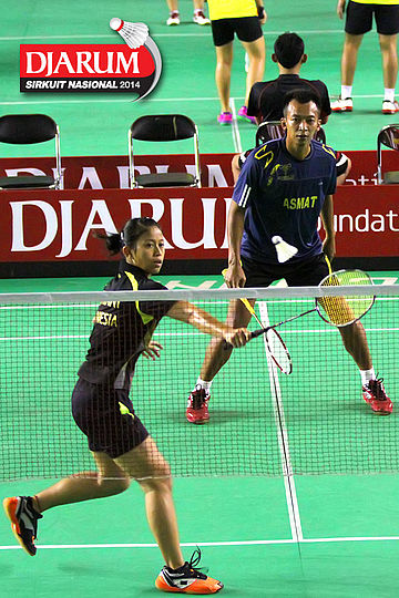 Hantoro/Deariska Putri (PB Djarum) bersiap menyambar pengembalian tanggung dari Ikhsan Adam/Uzchi Ananda (Guna Dharma)
