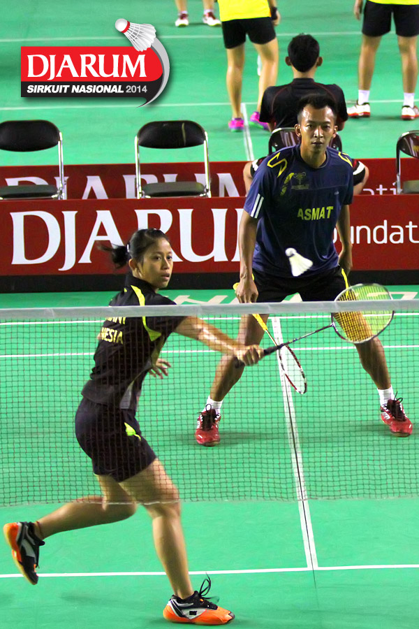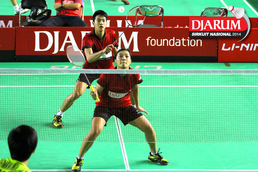 Ricky Alverino/Ristya Ayu (PB Djarum) bersiap menghadang serangan yang dilepaskan Joko Aji/Siti Wahyuni (Tangkas)