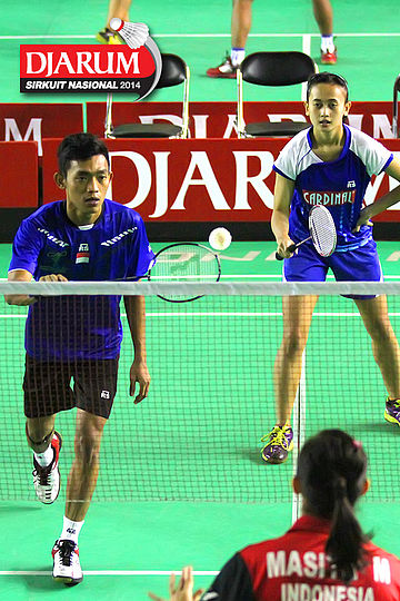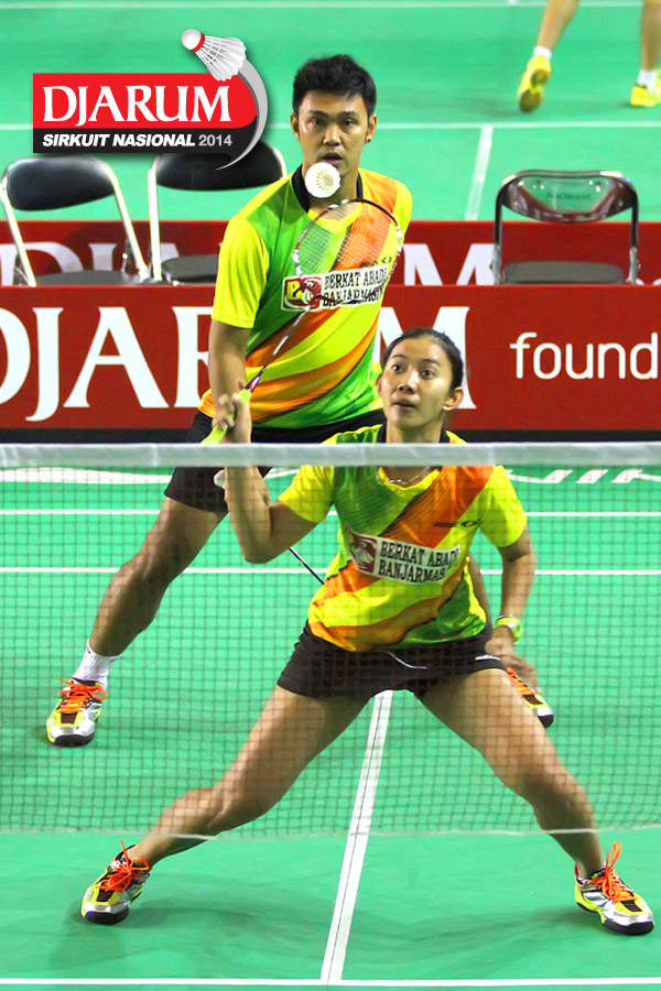 Lukhi Apri/Masita Mahmudin (Pelatnas) berhasil menghadang serangan yang dilepaskan Ridho Akbar/Imma Mutiah (Halim/Mutiara Bandung)