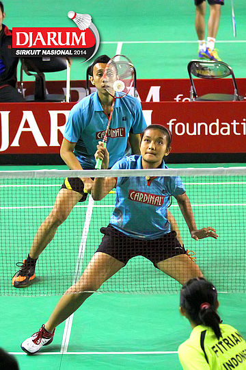 Ridho Akbar/Imma Mutiah (Halim/Mutiara Bandung) menyambut serve dari Lukhi Apri/Masita Mahmudin (Pelatnas)