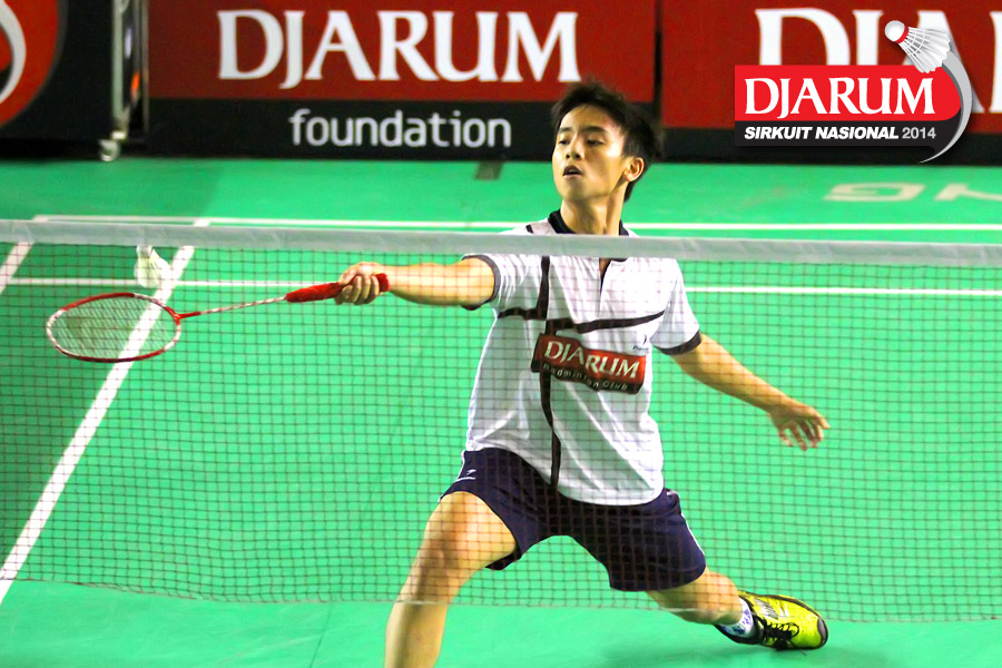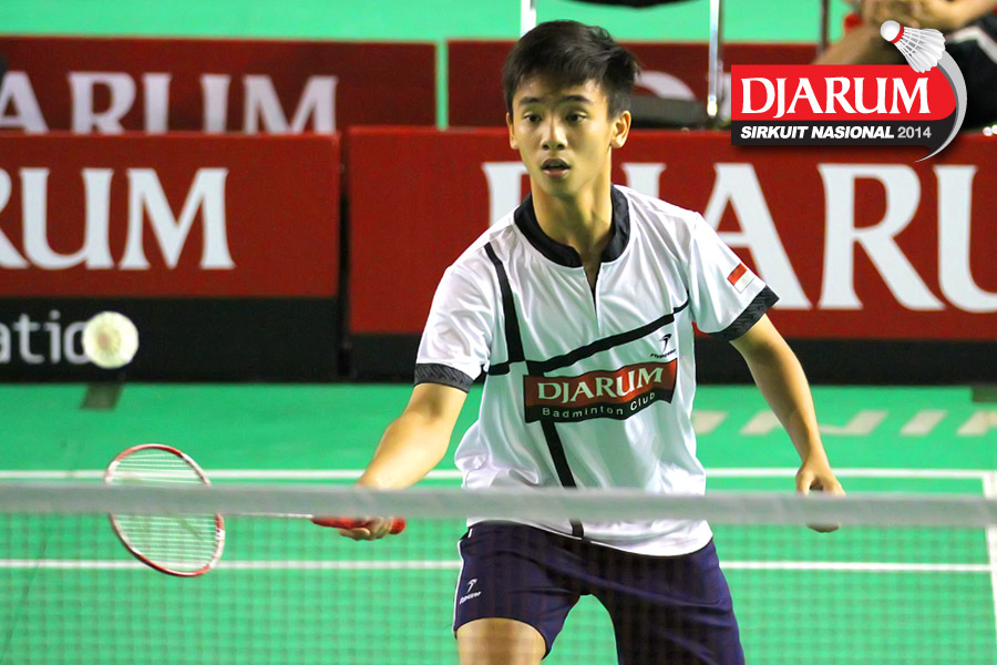 Calvin Ryan Mamonto (PB Djarum) mengembalikan shuttlecock ke arah Fauzi Ramadhan (Exist)
