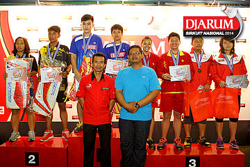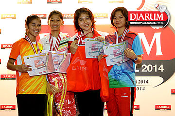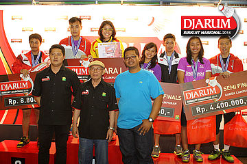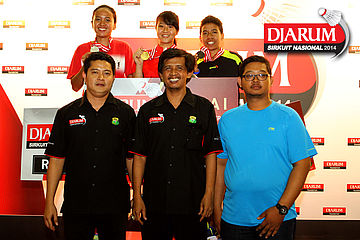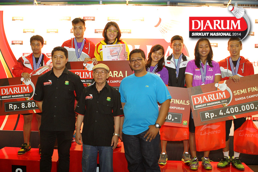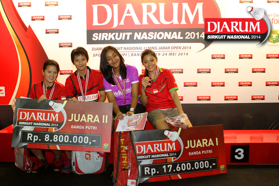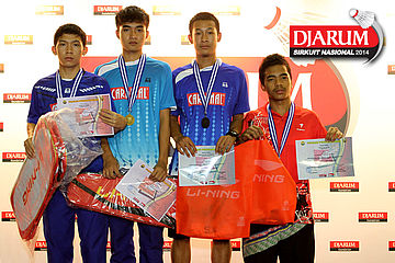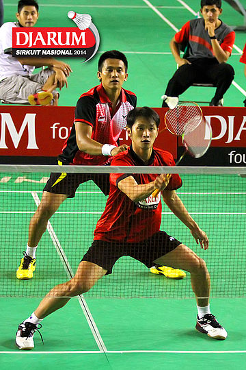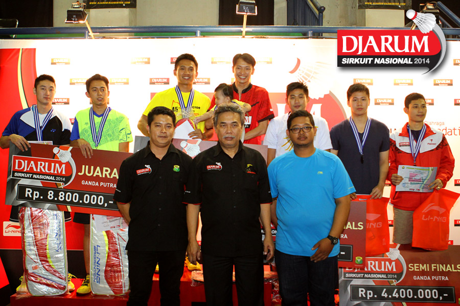 Afiat Yuris/Fran Kurniawan (PB Djarum) mengembalikan shuttlecock ke arah Erwin Wihardi/Syarief Syahmi (JR Enkei)