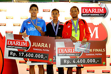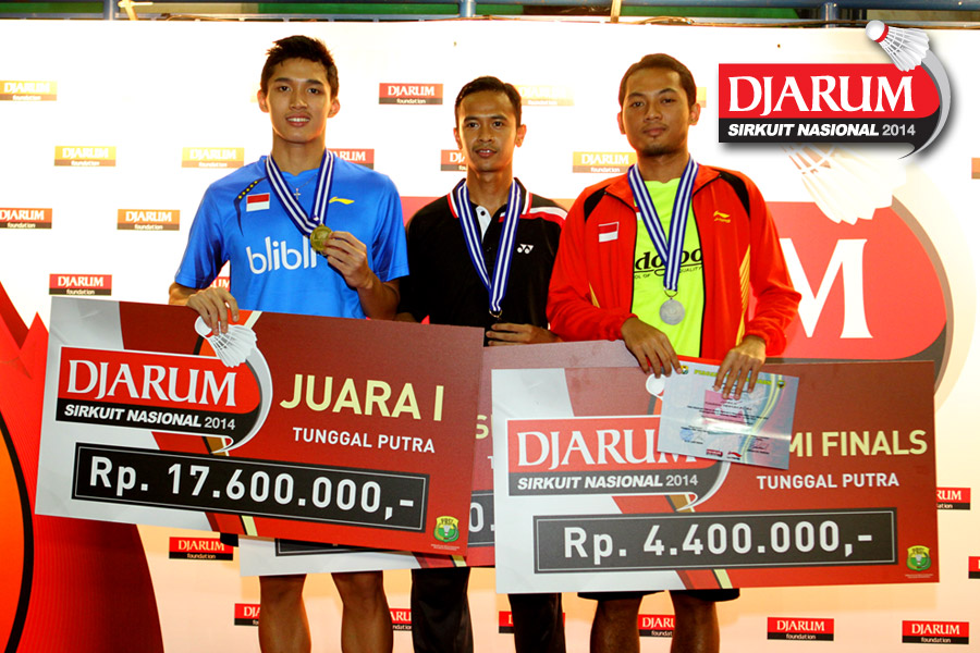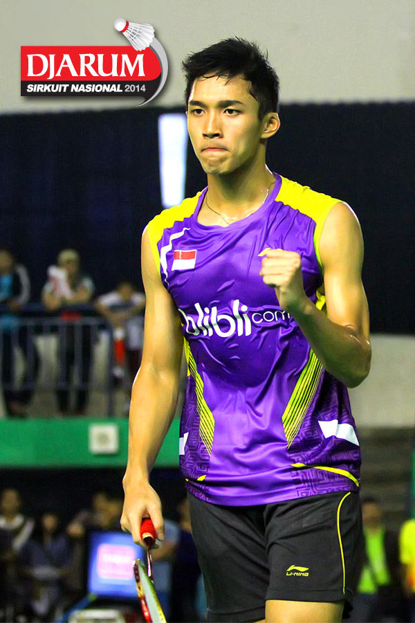 Ekspresi Jonatan Christie (Pelatnas) saat berhasil mencuri poin dari Setyaldi Putra (Guna Dharma)