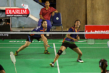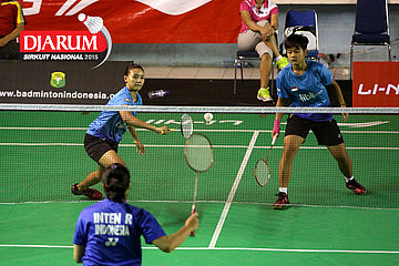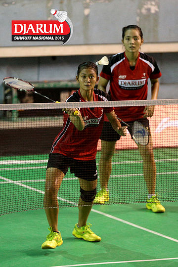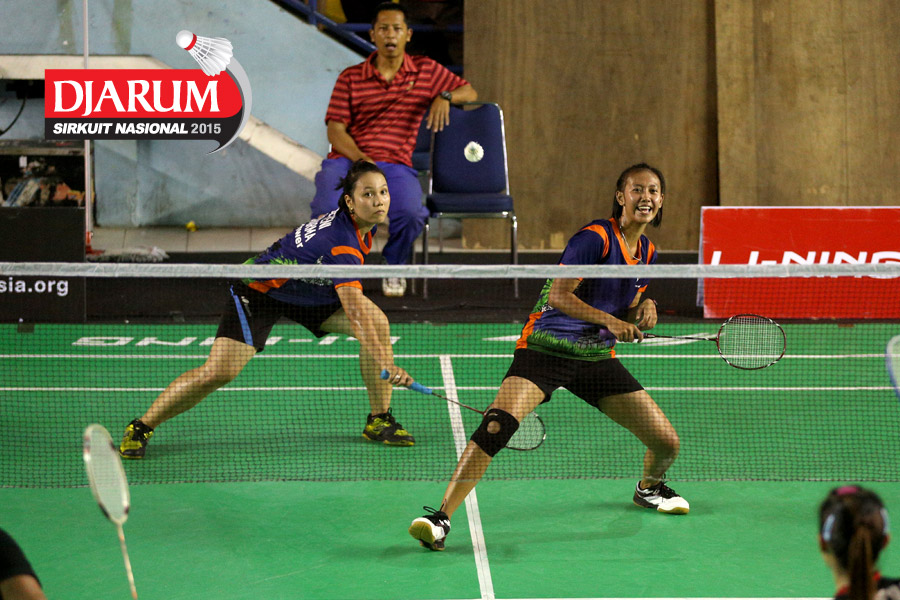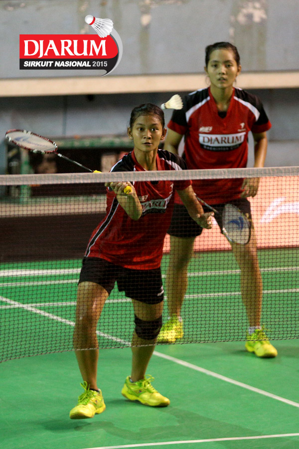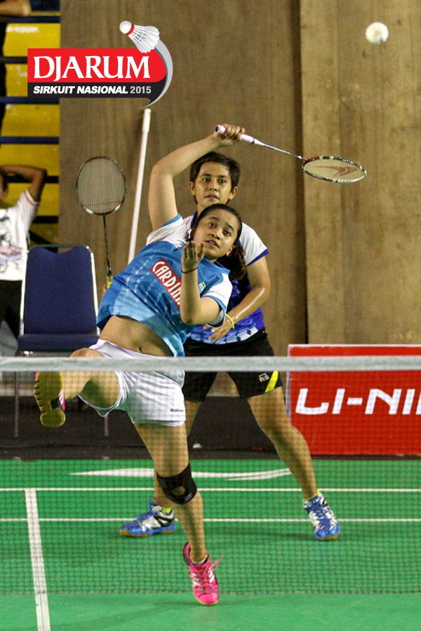 Meirisa Cindy/Nisak Puji (Pelatnas) mengembalikan shuttlecock ke arah Inten Ratnasari/Uzchi Ananda (SGS PLN/Guna Dharma).