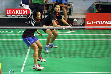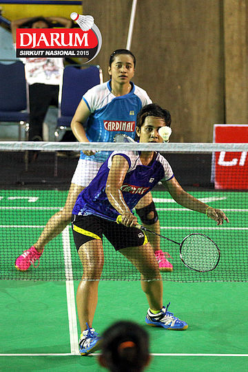 Febriani Endar/Jesicca Shohan (Djarum Kudus) menyambut pengembalian dari Nathalia Poluakan/Variella Aprilsasi (JR Enkei/Tjakrindo Masters).