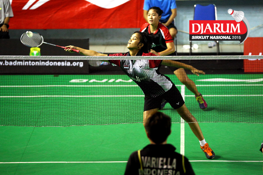 Febriani Endar/Jesicca Shohan (Djarum Kudus) menghadang serangan yang dilepaskan Nathalia Poluakan/Variella Aprilsasi (JR Enkei/Tjakrindo Masters).