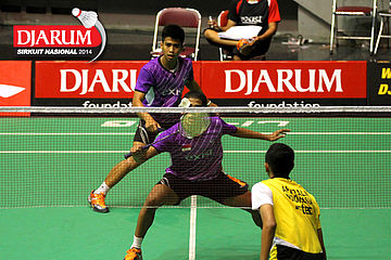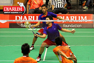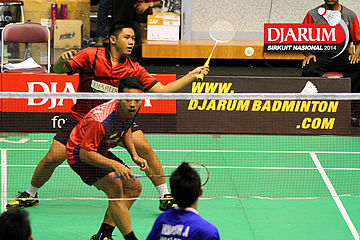 Aji Firmansyah/Andre Suryo (Mutiara Bandung) menyambut pengembalian dari Yahya Adi/Yantoni Edi (PB Djarum).