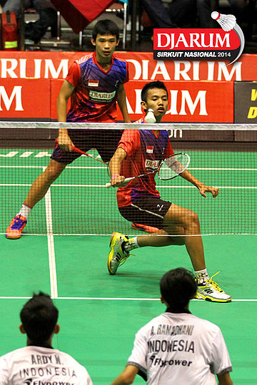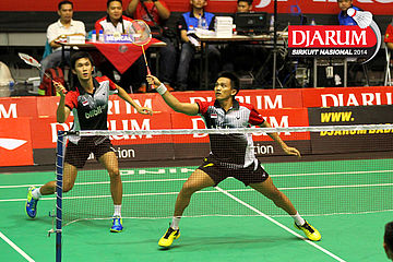 Afiat Yuris/Yohanes Rendy (PB Djarum) menghadang pengembalian dari Ardiansyah Putra/Fajar Alfian (Berkat Abadi/SGS PLN).