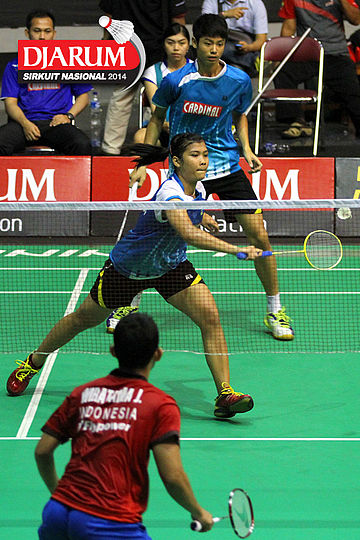 Beno Drajat/Yulfira Barkah (Mutiara Bandung) mengembalikan shuttlecock ke arah Jeka Wiratama/Marsheilla Gischa (PB Djarum).
