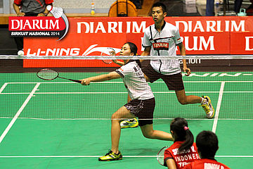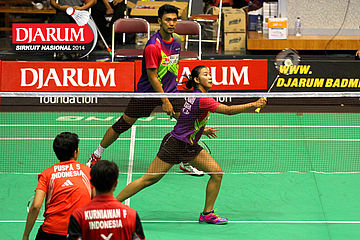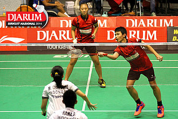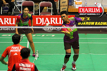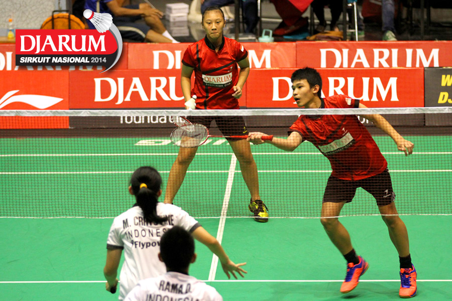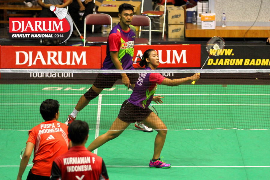 Fran Kurniawan/Shendy Puspa (PB Djarum) mengembalikan shuttlecock ke arah Ardiansyah Putra/Devi Tika Permatasari (Berkat Abadi/SGS PLN).