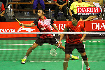 Alamsyah yunus (JR Enkei) mengembalikan shuttlecock ke arah Febriyan Irvanaldi (Hi Qua Wima).