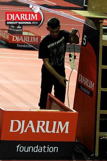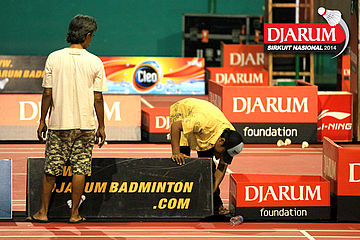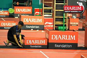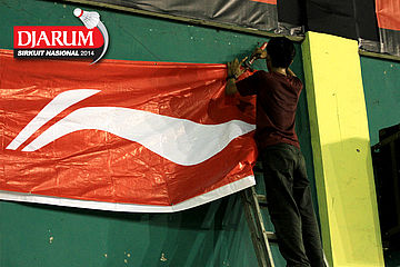 Seorang pekerja saat memasang pernak-pernik Djarum Sirkuit Nasional Li-Ning Open Jawa Timur Open 2014