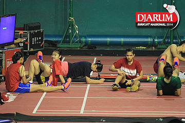Para atlet tunggal putri Djarum Kudus melakukan peregangan usai berlatih