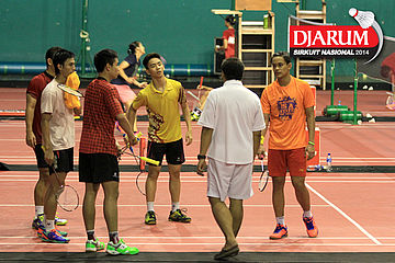 Para atlet tunggal putra Djarum Kudus saat mendapatkan pengarahan dari pelatih sebelum berlatih