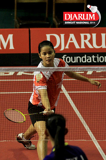 Vehrencia Debora (Pelatnas) bersiap menyambar pengembalian dari Renna Suwarno (Victory Bogor)
