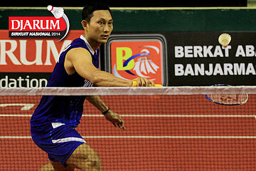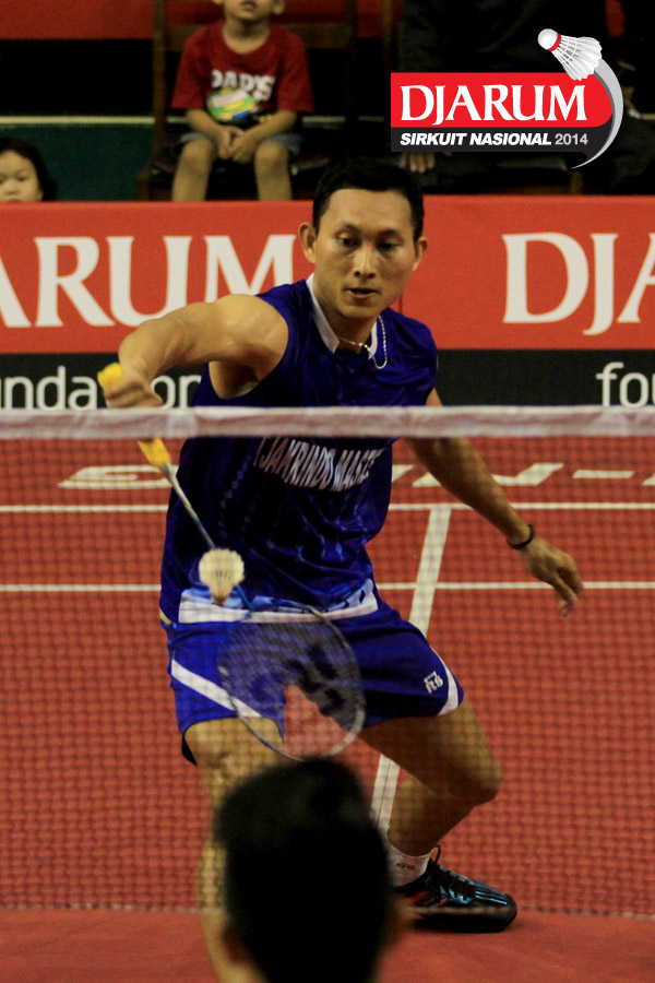 Sony Dwi Kuncoro (Tjakrindo Masters) mengembalikan shuttlecock ke arah Alvindo Saputra (Tangkas)