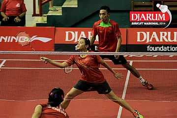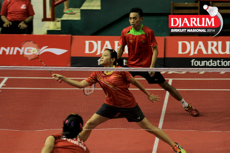 Ridho Akbar/Sri Wulan (Halim/Jaya Raya) mengembalikan shuttlecock ke arah Didit Juang/Deariska Putri (Djarum Kudus)