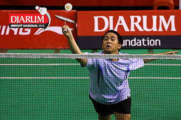 Ridho Islami/Novara Mega (Berkat Abadi) mengembalikan shuttlecock