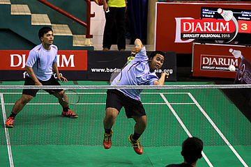 Gerald Siahaan/Yongky (Pelatprov Bali) mengembalikan shuttlecock